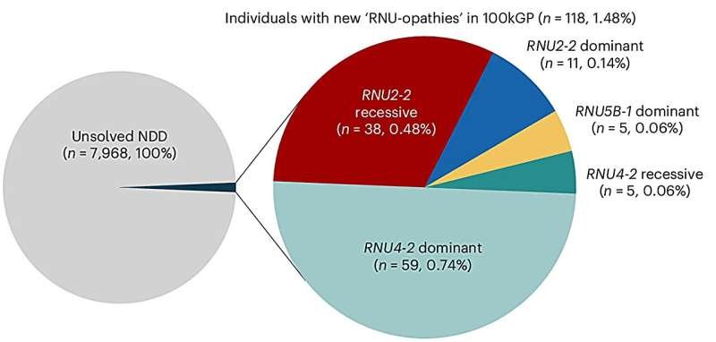Pie chart showing the number of individuals with unsolved NDD in 100kGP explained by pathogenic variants in the recently described 'RNU-opathy' genes. Credit: Nature Genetics (2026). DOI: 10.1038/s41588-026-02551-9