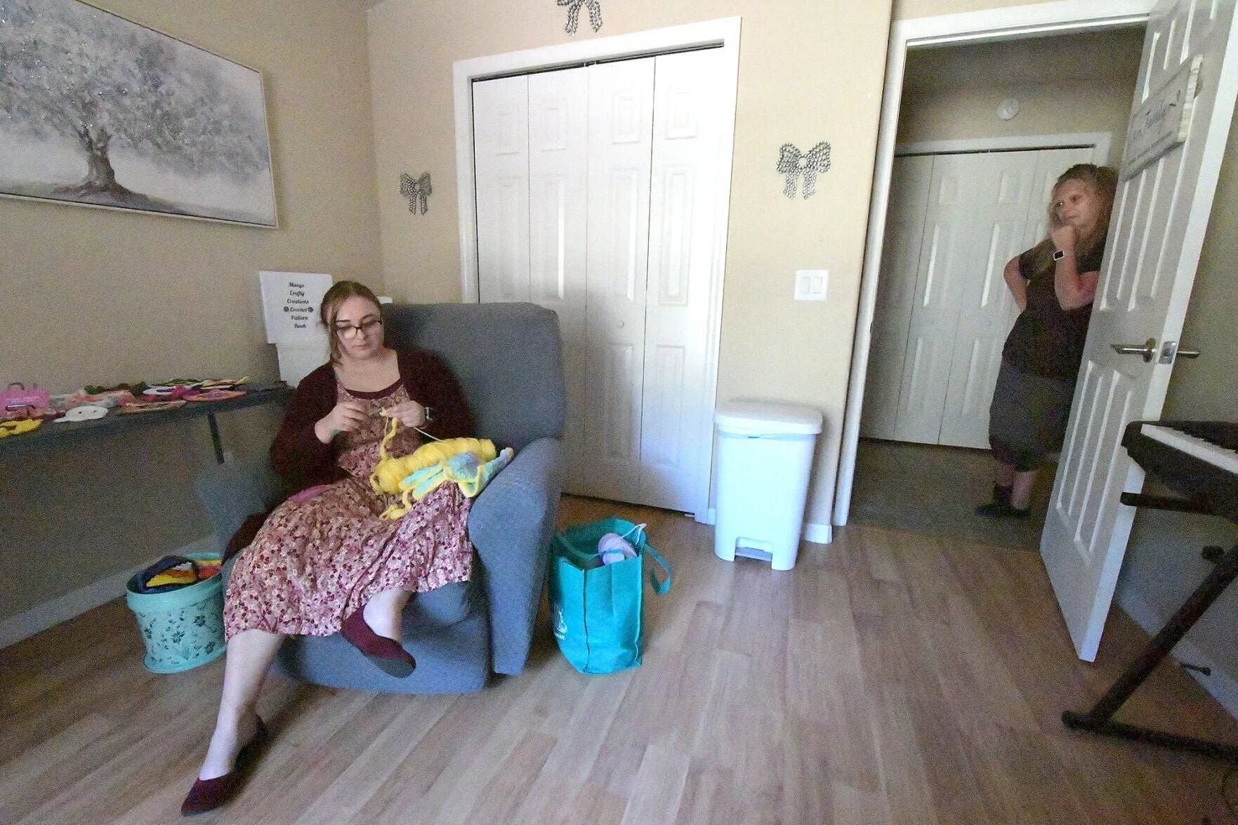 April Haganey, right, the mother of Maegan Haganey, watches her daughter crochet.